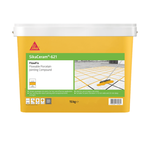 nSikaCeram 621 FlowFix Jointing Compound  is part of a high performance porcelain paving installation system, consisting of a bonding primer and jointing compound.nnIt is a controlled, cementitious flowable jointing grout which is applied by mixing with water on site and poured over joints with ease and worked into other exposed joints by squeegee. Once dry the surplus is simply washed off. SikaCeram 621 FlowFix Jointing Compound is a highly workable product that is non-permeable once cured.n