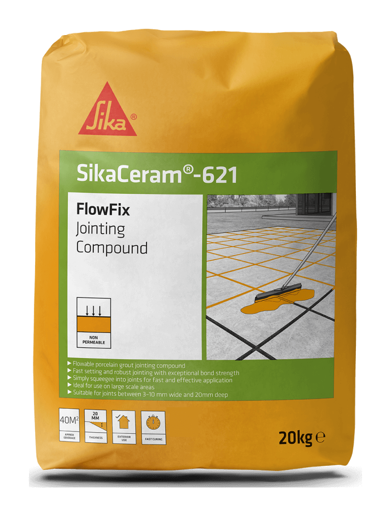 nPart of our landscaping range, SikaCeram 621 FlowFix Jointing Compound is a controlled, cementitious flowable jointing grout which is applied by mixing with water on site making it an excellent solution for porcelain patios. 621 FlowFix Jointing Compound is poured over joints with ease and worked into other exposed joints by squeegee. Once dry the surplus is simply washed off. SikaCeram 621 FlowFix Jointing Compound is a highly workable product that is non-permeable once cured.nnSuitable for joints between 3-10mm wide and 20mm in depth, SikaCeram 621 FlowFix Jointing Compound cures in 60 minutes to a non-permeable finish.nn nnSikaceram 621 FlowFixnn n