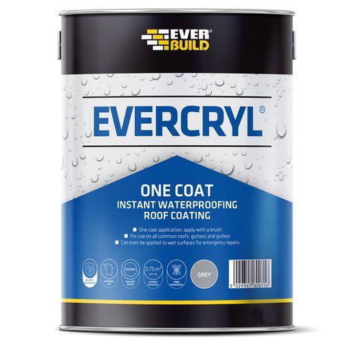 nEvercryl One Coat is a resin based, fibre reinforced roof repair compound which is effective on all common roofing surfaces, giving instant roof repairs even in the wet and on wet surfaces. May also be applied in frosty conditions down to -5°C.nnEvercryl One Coat is instantly waterproof when applied, there is no fear of wash off so emergency leaks can be tackled immediately as there is no need to wait for the rain to stop.nnEverycryl is brush applied and dries to a smooth seamless flexible membrane. Due to the high level of fibre reinforcement, Everycryl will bridge small cracks and only requires a one coat brush application to give instant and total water protection, even in areas subject to ponding. Eveycryl requires no primer on sound non-porous surfacesn